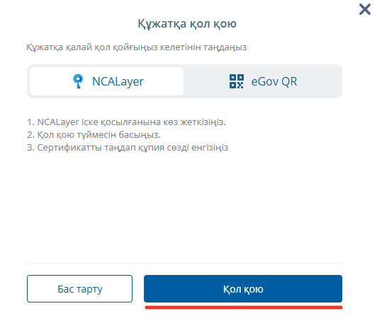 NCALayer іске қосылғанына көз жеткізіңіз. «Қол қою» батырмасын басыңыз. Сертификатты таңдаңыз және парольді енгізіңіз.