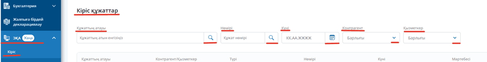 Бұл бөлімде сіздің контрагенттеріңізден немесе қызметкерлеріңізден келген құжаттар көрсетіледі. Ыңғайлылық үшін сіз фильтрлер мен іздеу параметрлерін пайдалана аласыз — құжатты атауы, нөмірі, күні, контрагенті немесе қызметкері бойынша таба аласыз.