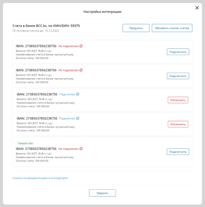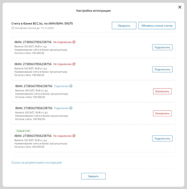 «Интеграцияны баптау» терезесінде сіздің ұйымыңыздың ИИН/БИН бойынша қолжетімді шоттардың тізімі көрсетіледі. Әр шот үшін IBAN, валюта, атауы және қалдығы көрсетіледі.
