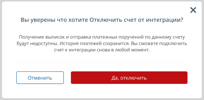 Жеке шотты өшіру үшін, оның жанындағы «Өшіру» түймесін басып, диалогта әрекетті растаңыз. Төлемдер тарихы сақталады, шотты кез келген уақытта қайта қосуға болады.