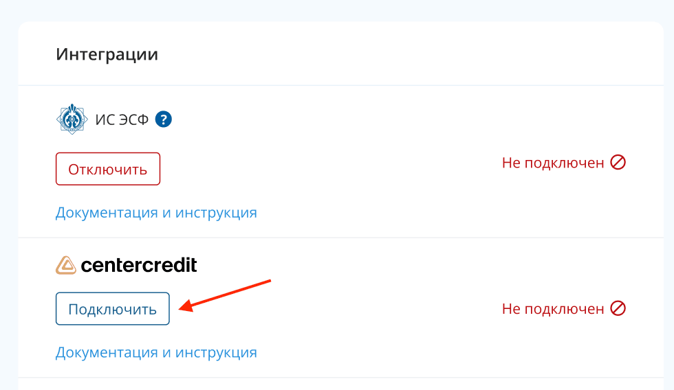 «Интеграциялар» бөлімінде centercredit блогын табыңыз да, «Қосылу» түймесін басыңыз.