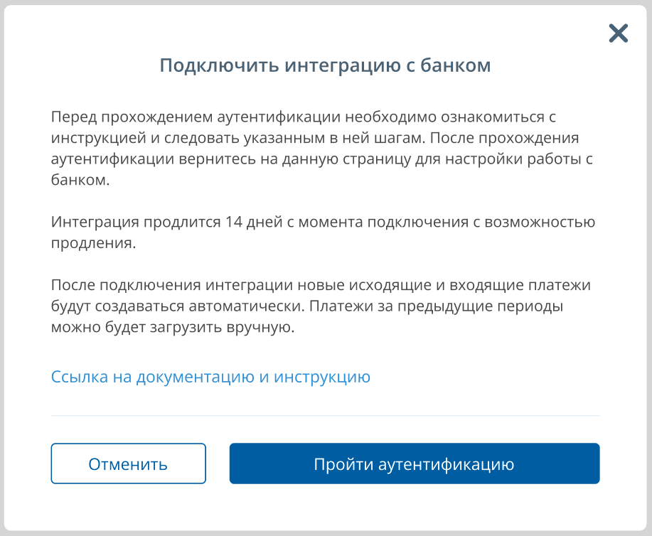 «Банкпен интеграцияны қосу» терезесі ақпаратпен ашылады: