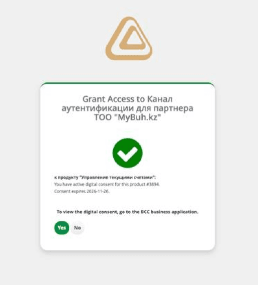 Сіз «Grant Access» банк бетіне бағытталасыз. ТОО "MyBuh.kz" серіктесіне «Ағымдағы шоттарды басқару» өнімінде қол жеткізуді растаңыз, Иә (Yes) түймесін басыңыз.