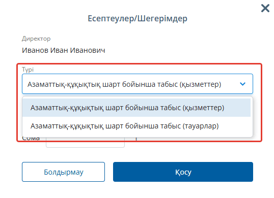 Егер сіз физикалық тұлғадан тауарлар алсаңыз, тауарлар үшін табысты таңдаңыз, егер қызметтер болса – қызметтер үшін табысты таңдаңыз. Бұл терезеде сатып алу сомасын енгізіп, "Қосу" батырмасын басыңыз.