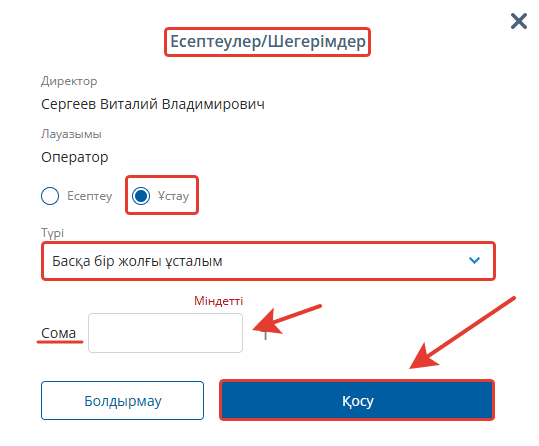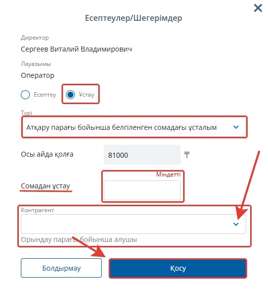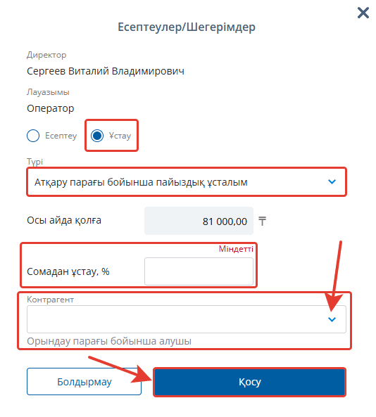 Әрдайым ұстап қалу жүргізілетін контрагентті көрсетіңіз, ұстап қалу үшін соманы көрсетіңіз және "Қосу" батырмасын басыңыз.
