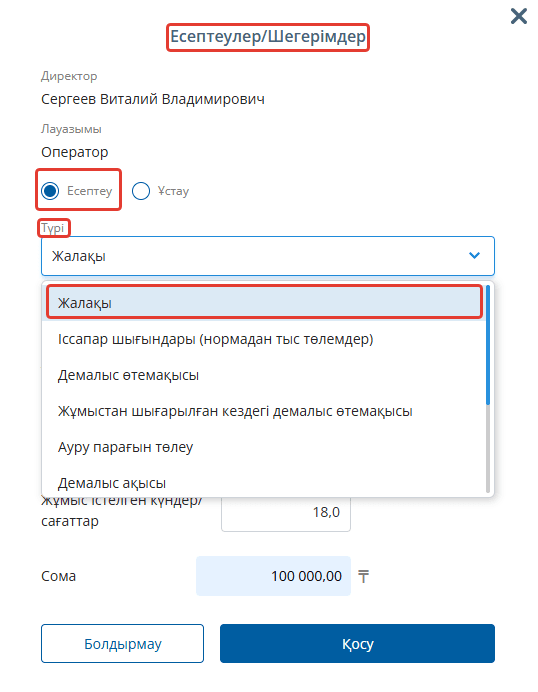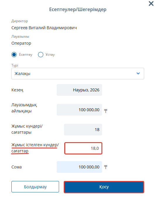 Мұнда барлық жұмыс күндерінен қанша күн факті бойынша жұмыс істелгенін көрсетіңіз, "Қосу" батырмасын басыңыз.