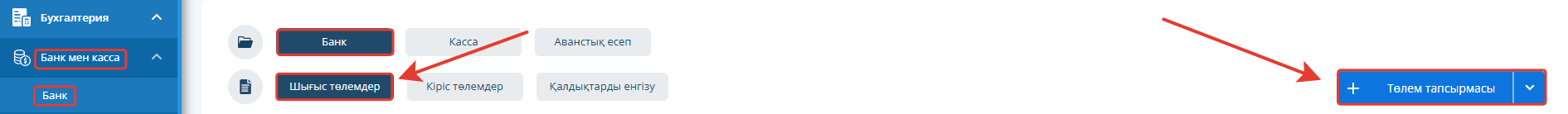 Жеткізушіге немесе бюджетке төлем тапсырмасын жасау үшін "Бухгалтерия - Банк - Банк және касса - Шығыс төлемдер" бөлімін таңдаңыз, "Төлем тапсырмасын қосу" батырмасын басыңыз.