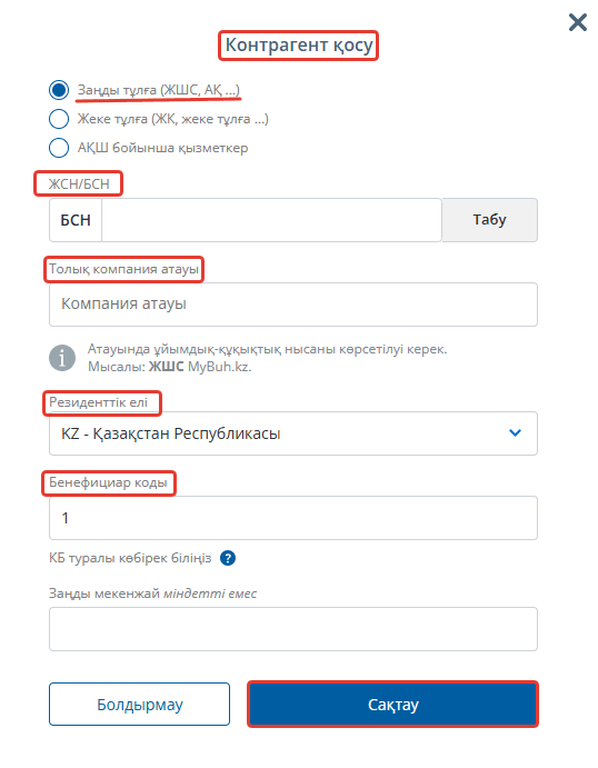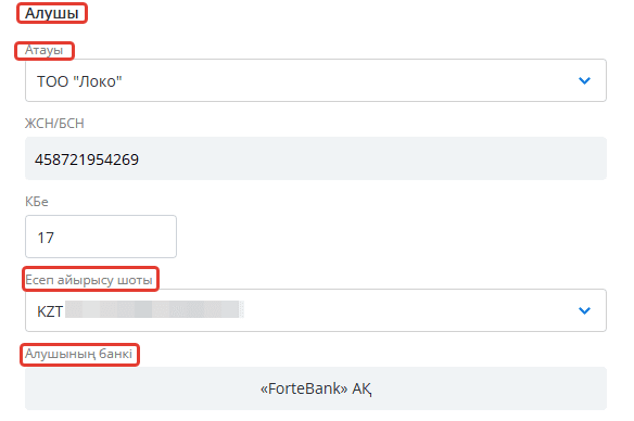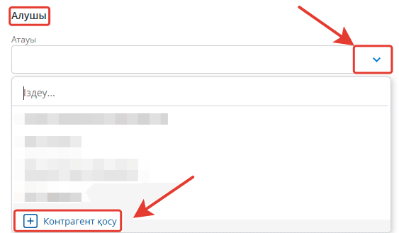 Алушыны енгізіңіз, егер анықтамада қажетті контрагент болмаса, "Контрагент қосу" батырмасын басыңыз - меншік формасын таңдаңыз - компанияның ЖСН немесе БСН-ін көрсетіңіз - атауы - бенефициар коды - ЖШС үшін бұл 17 - және резиденттік елді көрсетіңіз. "Сақтау" батырмасын басыңыз және осы контрагентті тізімнен таңдаңыз. Алушының есепшотын көрсетіңіз. Егер бұл жаңа енгізілген контрагент болса, есепшотты дәл солай қосыңыз. Шот нөмірін енгізіңіз және қажетті банкті таңдаңыз. БСН және Валюта автоматты түрде алынады.