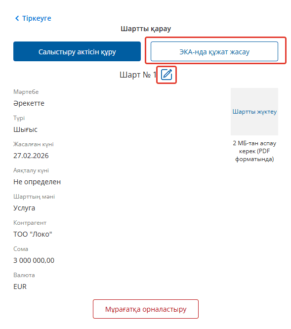 Карточкадан сіз «Өңдеу» батырмасын басу арқылы келісімге өзгерістер енгізе аласыз. Сондай-ақ ЭҚА форматында құжат жасау мүмкіндігі бар.