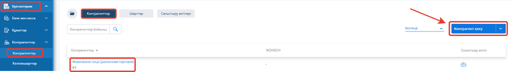 Бұл бөлім негізгі бухгалтерлік құжаттарды қалыптастыру кезінде өте маңызды. Контрагенттер мен келісімдерді қосу үшін «Контрагенттер» бөліміне өтіңіз - мұнда сіз Физикалық тұлға контрагентін көресіз, ол тауарлар мен қызметтерді бөлшек саудада сату үшін автоматты түрде жасалған. Жаңа контрагент қосу үшін «Контрагент қосу» батырмасын басыңыз.