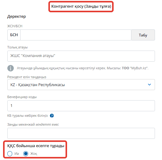 Заңды тұлғаны қосайық, мысалы, ЖШС – БСН мен атауды дұрыс енгізіңіз. ЖШС үшін резиденттік ел Қазақстан Республикасы, ал Бенефициар коды 17 болады. Заңды мекенжайды және ҚҚС төлеушінің статусын көрсетіңіз.