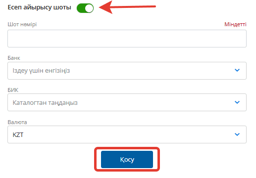 Енді есепшоттың слайдерін қосыңыз – есепшот нөмірін және банкті енгізіңіз. БСН және валюта автоматты түрде жүктеледі. «Қосу» батырмасын басыңыз.