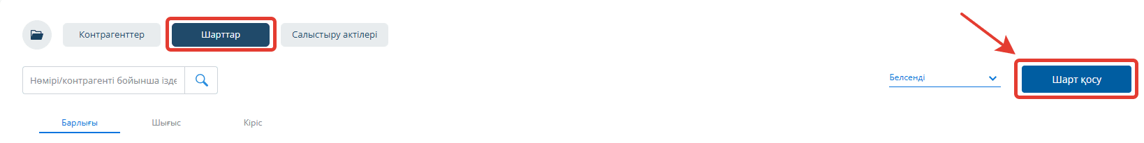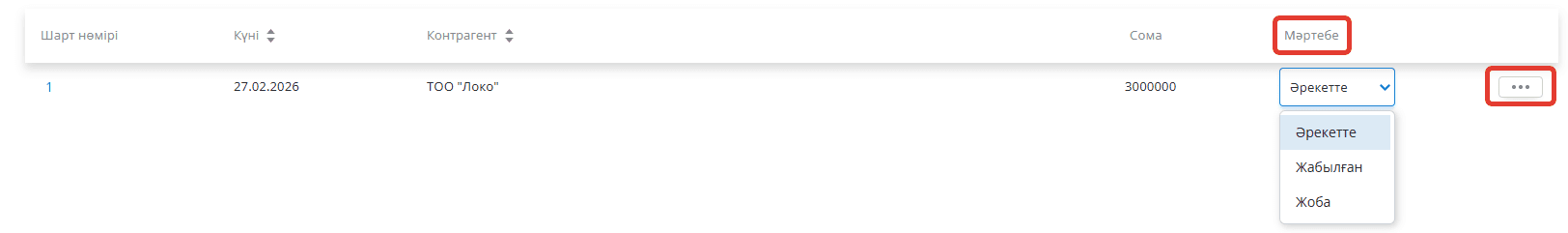 Келісімдер тізімінде сіз келісімнің статусын өзгерте аласыз, архивке орналастыра аласыз және жасалған келісімнің карточкасын көре аласыз.