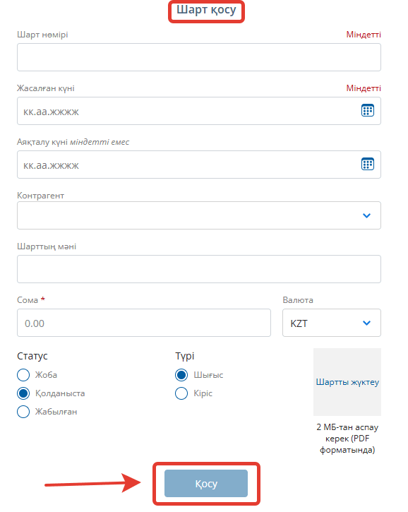 Барлық ұсынылған өрістерді толтырыңыз: келісім нөмірі, жасалған күні және аяқталу күні, егер белгілі болса. Контрагентті таңдаңыз және келісімнің тақырыбын ақпараттық өріске жазыңыз. Соманы және валютаны тағайындаңыз. Мұнда сіз келісімді WORD немесе PDF форматында жүктей аласыз. «Қосу» батырмасын басыңыз.