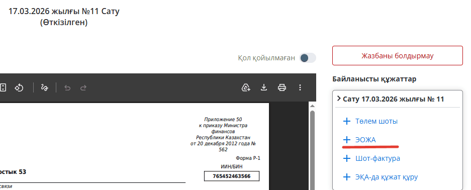Құжатты сақтағаннан кейін сіздің алдыңызда құжаттың баспа түріндегі қарау беті ашылады. Осы бетте сіз құжатты өзгерте, жүктей, басып шығара немесе жоя аласыз. Сондай-ақ, дайын құжатты өзіңізге немесе контрагентіңізге жіберу үшін «Жіберу» батырмасын басыңыз.