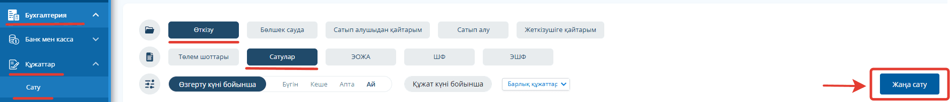 Электрондық орындалған жұмыстар актісін қалыптастыру үшін алдымен ОЖА жасау қажет. «Бухгалтерия – Құжаттар – Сату» бөлімшесіне өтіп, «Сатулар» бөлімінде «Жаңа сату» батырмасын басыңыз. ОЖА-ды қалай қалыптастыруға болатынын басқа нұсқаулықтан қараңыз.