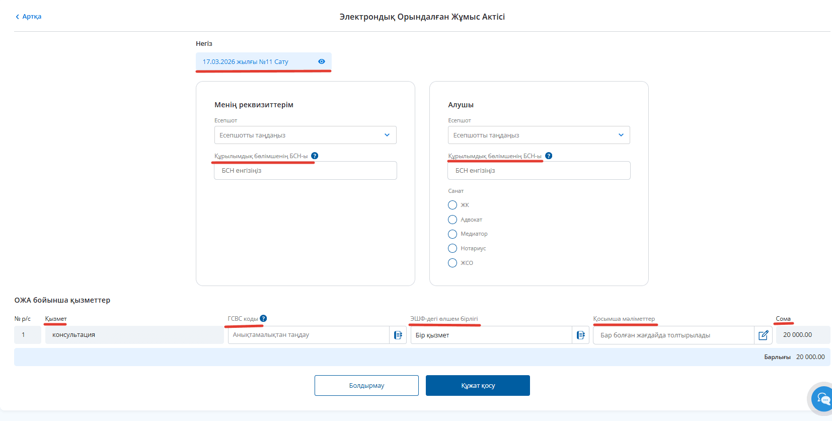 Есепшот бойынша деректер ОЖА-дан автоматты түрде алынады, құрылымдық бөлімшенің БСН жолы тек ЭОЖА алушысы құрылымдық бөлімше/филиал болғанда толтырылады. Қызмет атауы автоматты түрде толтырылады, МӘС кодын тізімнен таңдау қажет, ол ЭОЖА-ды толтыру және жіберу үшін қажет. ЭШФ-да өлшем бірлігін көрсетіңіз және қажет болса қосымша мәліметтерді толтыра аласыз. «Құжат қосу» батырмасын басыңыз.