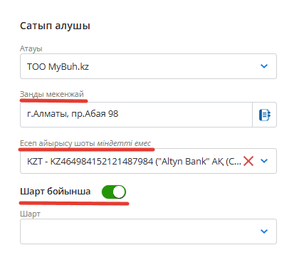 Егер сіз жаңа контрагентті құжаттан тікелей енгізсеңіз, сатып алушының заңды мекенжайы мен есепшотын толтыру қажет. Бұл құжатта есепшотты толтыру міндетті емес. Сондай-ақ контрагентпен келісімді қосуға болады.