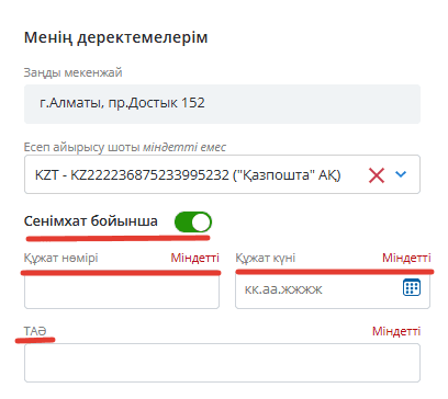 Егер сенімхат болса, «Сенімхат бойынша» жүгірткіні белгілеңіз және сенімхат деректерін енгізіңіз.