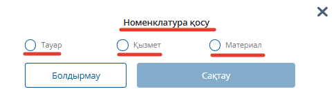 Келесі номенклатура тізіміне өтіп, тауар немесе қызмет атауын енгізіңіз, егер ол бұрын енгізілмеген болса, «Номенклатураны қосу» батырмасын басыңыз. «Тауар» номенклатурасын қосқанда жүкқұжат, «Қызмет» номенклатурасын қосқанда орындалған жұмыстар актісі қалыптасады.