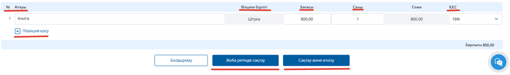 Негізгі параметрлер: атауы мен өлшем бірлігі. Келесі тізімде тауар немесе қызметіңізге баға белгілеңіз, санын көрсетіңіз, сондай-ақ ҚҚС мөлшерін және пайызын енгізіңіз. Сіз құжатта шектеусіз жолдар енгізе аласыз. Тауарлар накладная қалыптастырады, ал қызметтер орындалған жұмыстар актісін қалыптастырады. Жолдарды дұрыс толтырыңыз және «Жоба ретінде сақтау» немесе «Сақтау және өткізу» батырмасын басыңыз.
