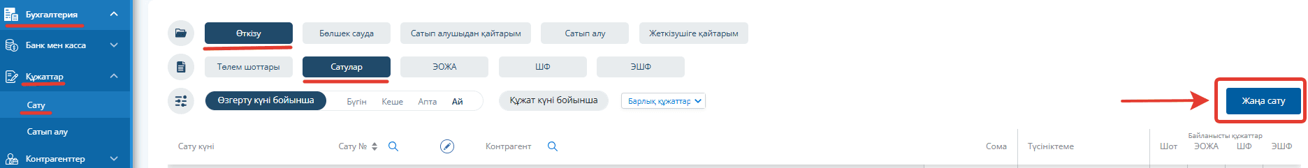 «Бухгалтерия – Құжаттар – Сату» бөлімінде «Өткізу – Сатулар» тармағына өтіңіз. Оң жақ жоғарғы бұрышта «Жаңа сату» батырмасын басыңыз.