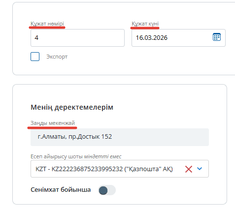 Құжат нөмірі мен күні, заңды мекенжай автоматты түрде қойылады, бірақ сіз әрқашан осы параметрлерді өзгерте аласыз.
