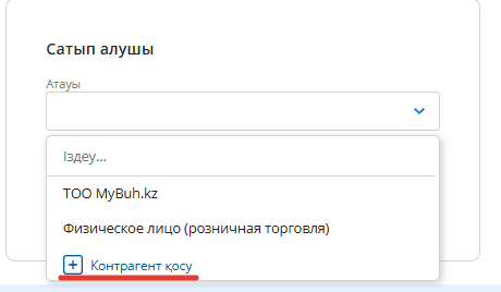 Сіз тауарды немесе қызметті жүзеге асыратын контрагентті таңдаңыз – егер бұл жаңа контрагент болса, оны «Контрагентті қосу» түймесін басу арқылы қосуға болады.