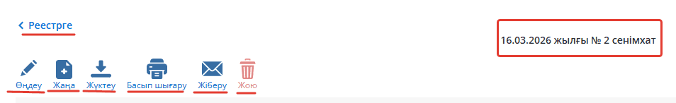 Құжатты сақтағаннан кейін, сіздің алдыңызда құжаттың баспа түріндегі қарау беті ашылады. Осы бетте сіз бұл құжатты өзгерте аласыз, жүктей аласыз, басып шығара аласыз, жоя аласыз немесе тікелей контрагентіңізге жібере аласыз.