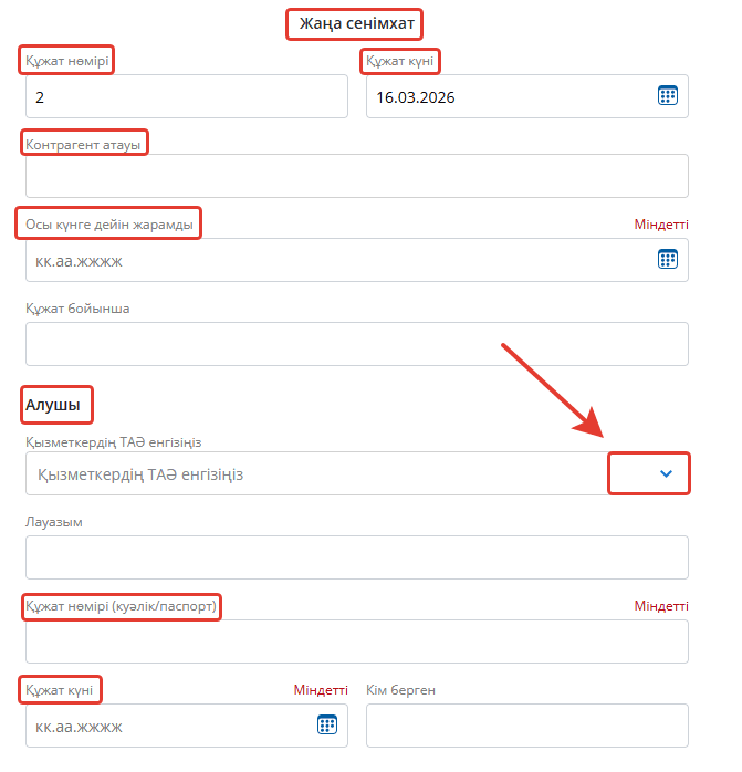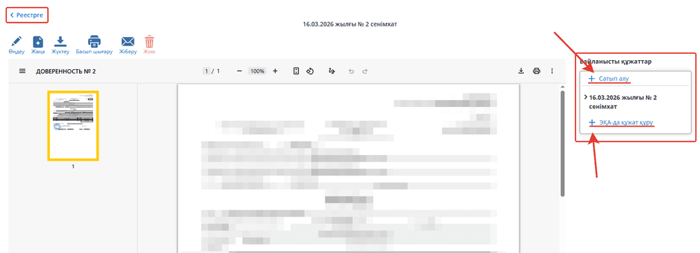 Сондай-ақ ЭДО-да құжат жасау мүмкіндігі бар. Мұнда алдын ала қарау арқылы, сіз «реестрге» батырмасын басу арқылы осындай құжаттардың реестріне өтуді немесе оң жақтағы байланысты құжатты көруге болады, сонымен қатар сенімхат негізінде жаңа сатып алуды енгізе аласыз.