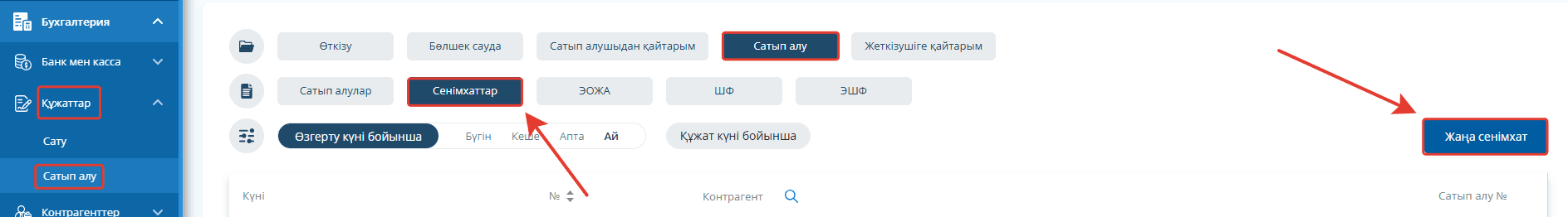 Тауарды қабылдау үшін сенімхат жазу үшін «Сатып алу» бөлімшесіне, «Сенімхаттар» қойындысына өтіп, «Жаңа сенімхат» батырмасын басыңыз.