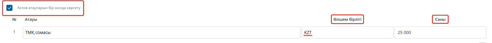 Егер сіз ақша өлшемінде сенімхат жазғыңыз келсе, онда «Активтердің атауларын бір жолмен көрсету» белгісін қоюыңыз керек, валютаны көрсетуіңіз және санды ақша сомасына өзгертуіңіз керек, «Қосу» батырмасын басыңыз.