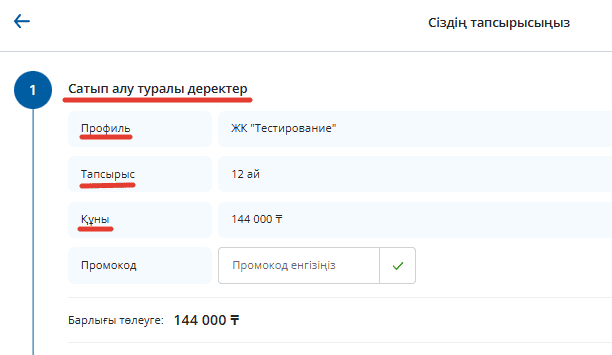Таңдалған тарифтен кейін, сізде жазылым сатып алынатын профиль, жазылым мерзімі және жазылым құны көрсетілген тапсырыс қалыптасады.