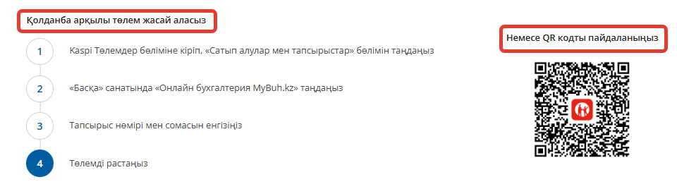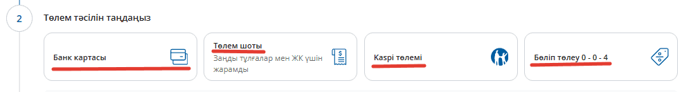 Kaspi.kz арқылы төлеу үшін, экрандағы берілген нұсқауларды орындаңыз, онда сіз Банк қосымшалары арқылы немесе Kaspi Qr арқылы төлем жасай аласыз: