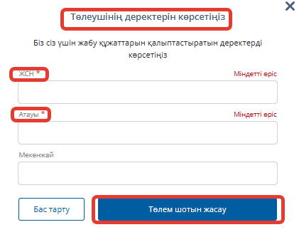2. "Төлем шоты" таңдалғанда, төлеушінің реквизиттерін көрсету қажет: ЖСН немесе БСН, атауы, мекенжайды толтыру міндетті емес, содан кейін "Төлем шотын жасау" батырмасын басу керек.