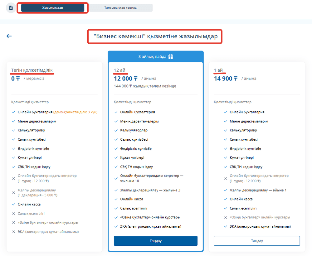 Жазылымдар бөлімінде сіз қолжетімді тарифтерді таңдай аласыз. Бізде 3 тариф бар: сынақ нұсқасы, айлық жазылым және жылдық жазылым.