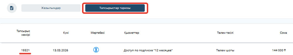 Төлем жүргізілгеннен кейін, сізге орындалған төлем тапсырмасын және тапсырыс нөмірін қызметтің техникалық қолдауына ұсыну қажет, ол бетінің оң жақ төменгі бұрышында орналасқан. Тапсырыс нөмірін басты бетте "Жазылымдар - Тапсырыс тарихы" батырмасын басу арқылы көре аласыз. Төлем тапсырмасын және тапсырыс нөмірін жібергеннен кейін, қызметке қолжетімділік ашылады.