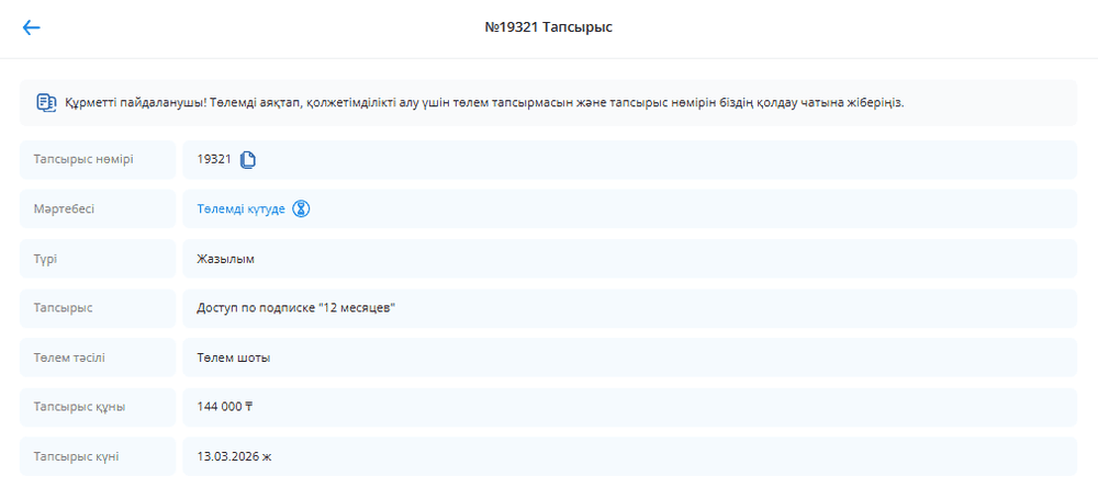 3. Kaspi.kz арқылы төлем жасағанда, сізде де тапсырыс қалыптасады, онда: тапсырыс нөмірі, статус, төлем әдісі, жазылым сатып алынатын мерзім және құны көрсетіледі.