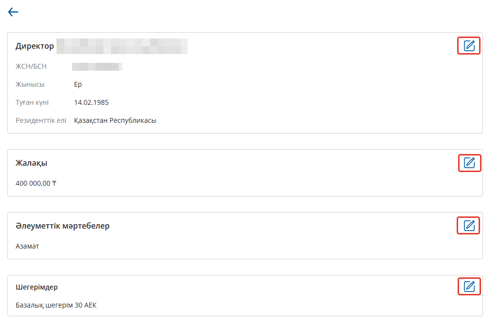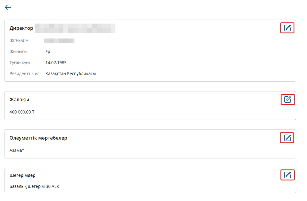 Директор туралы ақпаратты өзгерту үшін "Менің деректемелерім - Директор" бөліміне кіріп, әр бөлімде қажетті түзетулерді енгізу қажет.