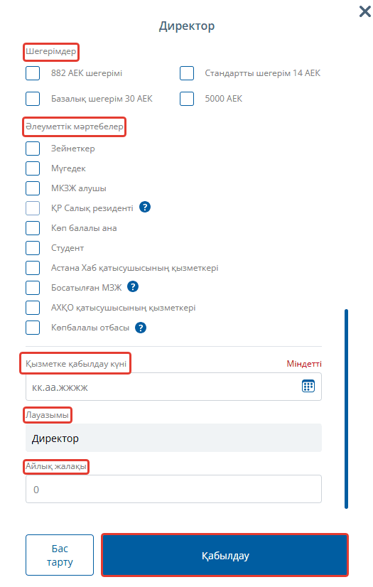 Содан кейін стандартты шегерім құқығын, директордың әлеуметтік статусын көрсетіңіз, міндетті түрде толтыру қажет деректер - лауазымға қабылданған күні және жалақы, "Жалдау" батырмасын басыңыз.