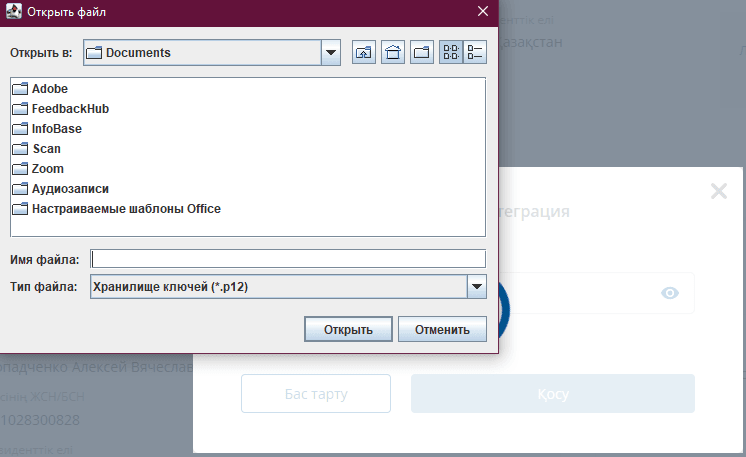 Содан кейін «Қосылу» түймесін басасыз, және сіздің компьютеріңізден ЭЦҚ жүктеу үшін терезе ашылады, ЭЦҚ жүктеп, ЭЦҚ паролін енгізіп, әрекетті қол қойып, қосылу орнатылды.