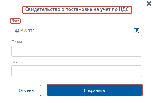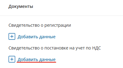 Келесіде сіз ҚҚС бойынша тіркеу және есепке алу куәліктерін қосуға болады, егер олар болса. "Деректерді қосу" түймесін басыңыз.