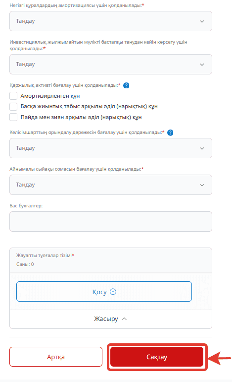 Соңында бас бухгалтер көрсетіледі және жауапты тұлғалар қосылады. Барлық міндетті өрістер толтырылуы тиіс, содан кейін деректер тиісті батырмамен сақталады.