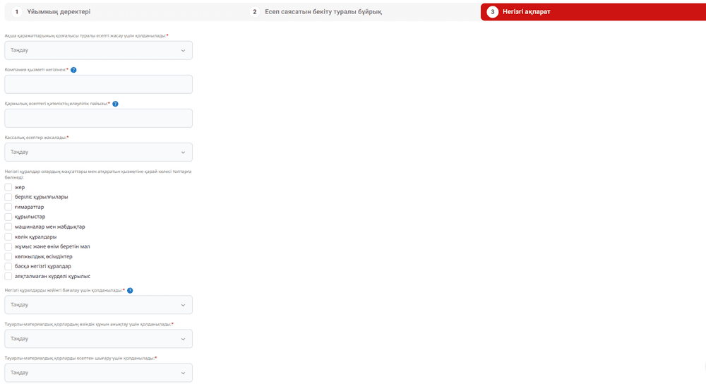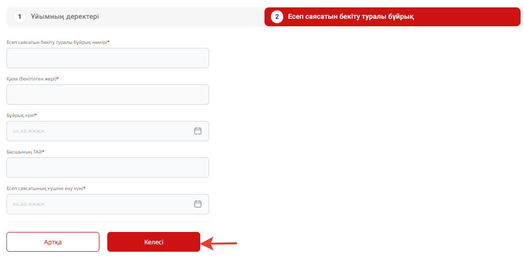 Барлық міндетті өрістерді ұйымдық-құқықтық формаға байланысты толтыру қажет. Толтырғаннан кейін "Келесі" батырмасын басыңыз.