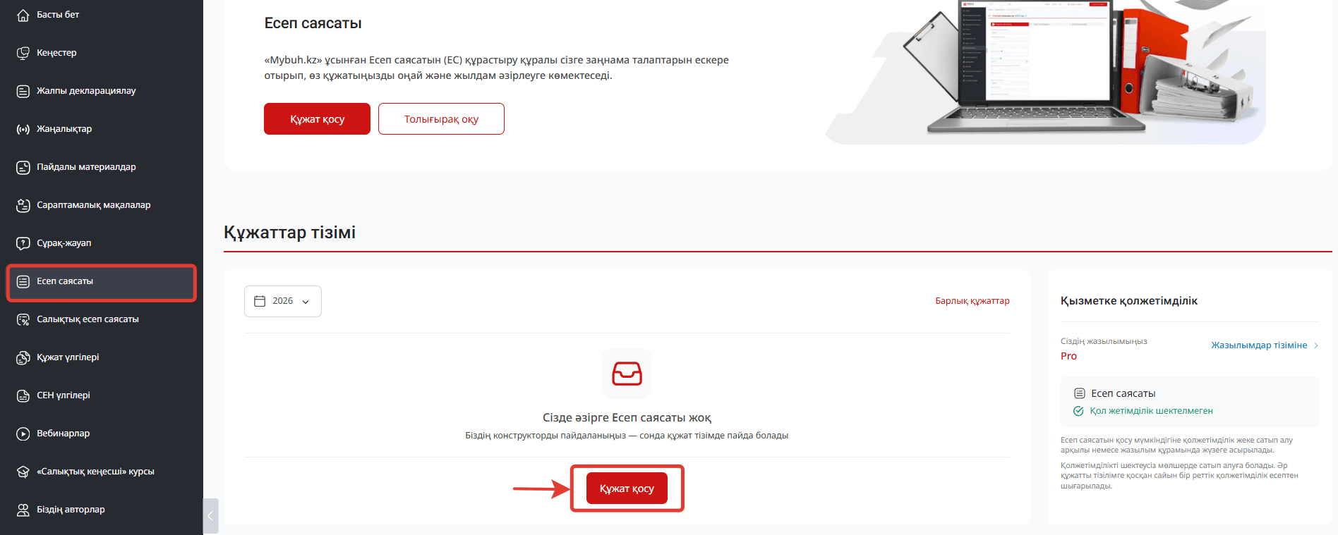 Есеп саясатын қалыптастыру үшін "Есеп саясаты" бөліміне өтіп, "Құжат қосу" батырмасын басу қажет.