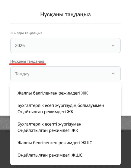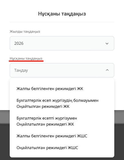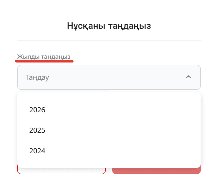 «Құжат қосу» батырмасын басқаннан кейін, нұсқаны таңдауға болатын терезе пайда болады. Бұл терезеде жылды көрсету және нұсқаны таңдау қажет.