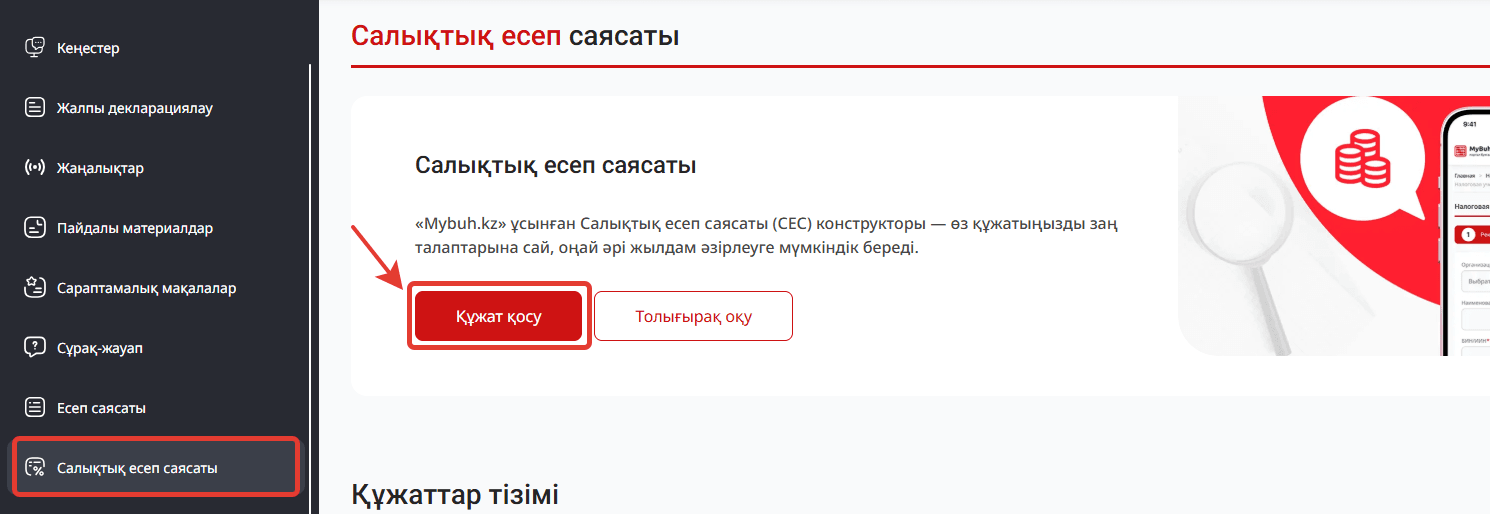 Салықтық есеп саясатын жасау үшін оң жақтағы мәзірге өтіп, "Салықтық есеп саясаты" бөлімін таңдаңыз. Содан кейін "Құжат қосу" батырмасын басыңыз.