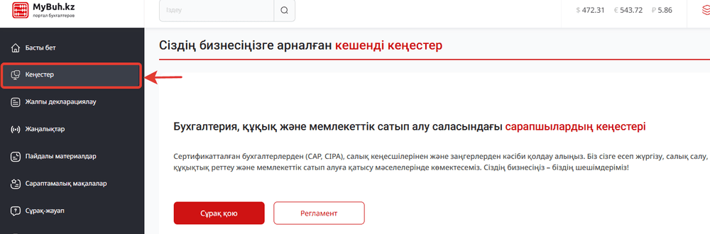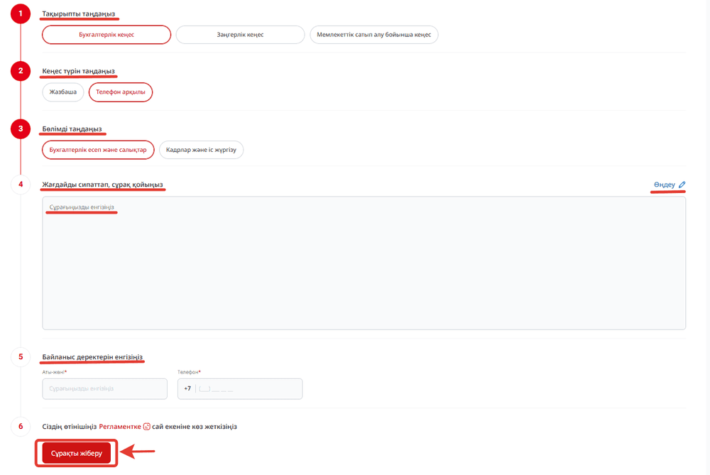 Кеңес тақырыбын таңдаңыз - бухгалтерлік кеңес, заңгерлік кеңес немесе мемлекеттік сатып алу бойынша кеңес. Кеңес түрін таңдаңыз - "Жазбаша", "Телефон арқылы". Бөлімді таңдаңыз, содан кейін жағдайды және сұрағыңызды сипаттаңыз. Телефондық кеңес үшін міндетті түрде аты-жөніңіз бен телефон нөміріңізді көрсетуіңіз қажет. "Жіберу" батырмасын басыңыз.