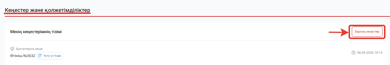 Өтініштің статусын білу немесе консультация тарихын қарау үшін "Кеңестер" бөлімін ашыңыз, "Кеңестер және қолжетімділіктер" бөліміне түсіңіз, "Барлық кеңестер" батырмасын басыңыз. Осы бөлімде сіз барлық өтініштеріңіз бен олардың статусын көресіз.