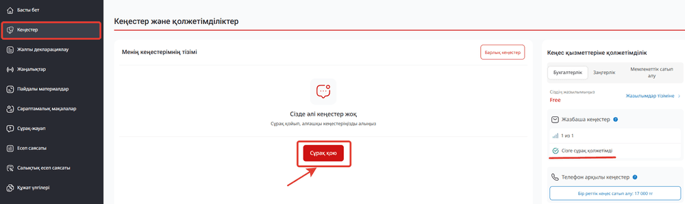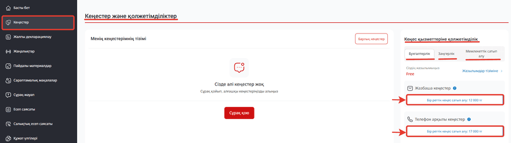 Сіз тарифтан тыс жазбаша және телефондық консультацияларды бөлек сатып ала аласыз. "Кеңестер" бөліміне өтіп, "Консультациялар мен қолжетімділіктер" бөлімін айналдырыңыз. Кеңес тақырыбын таңдаңыз - бухгалтерлік, заңгерлік, мемлекеттік сатып алулар. Сізге қандай кеңес қажет - жазбаша немесе телефондық, "12 000тг-ге бір реттік сатып алу" немесе "17 000тг-ге бір реттік сатып алу" батырмасын басыңыз.